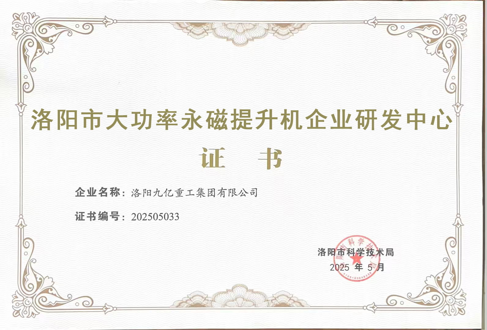 洛陽市大功率永磁提升機(jī)企業(yè)研發(fā)中心證書